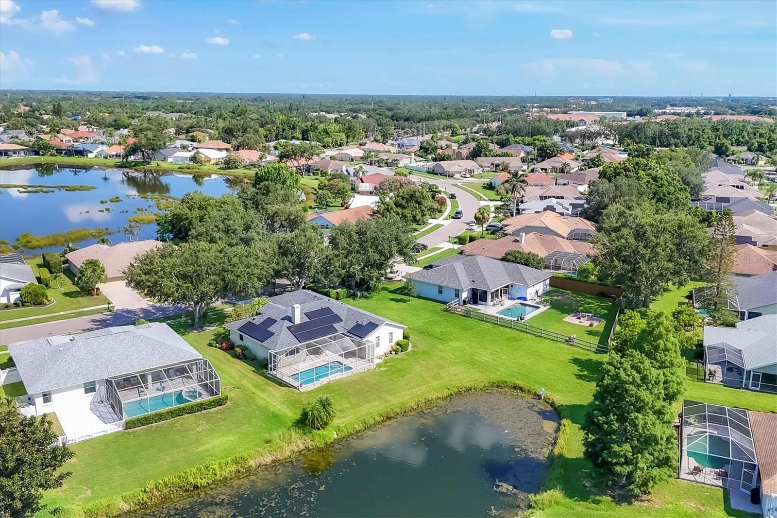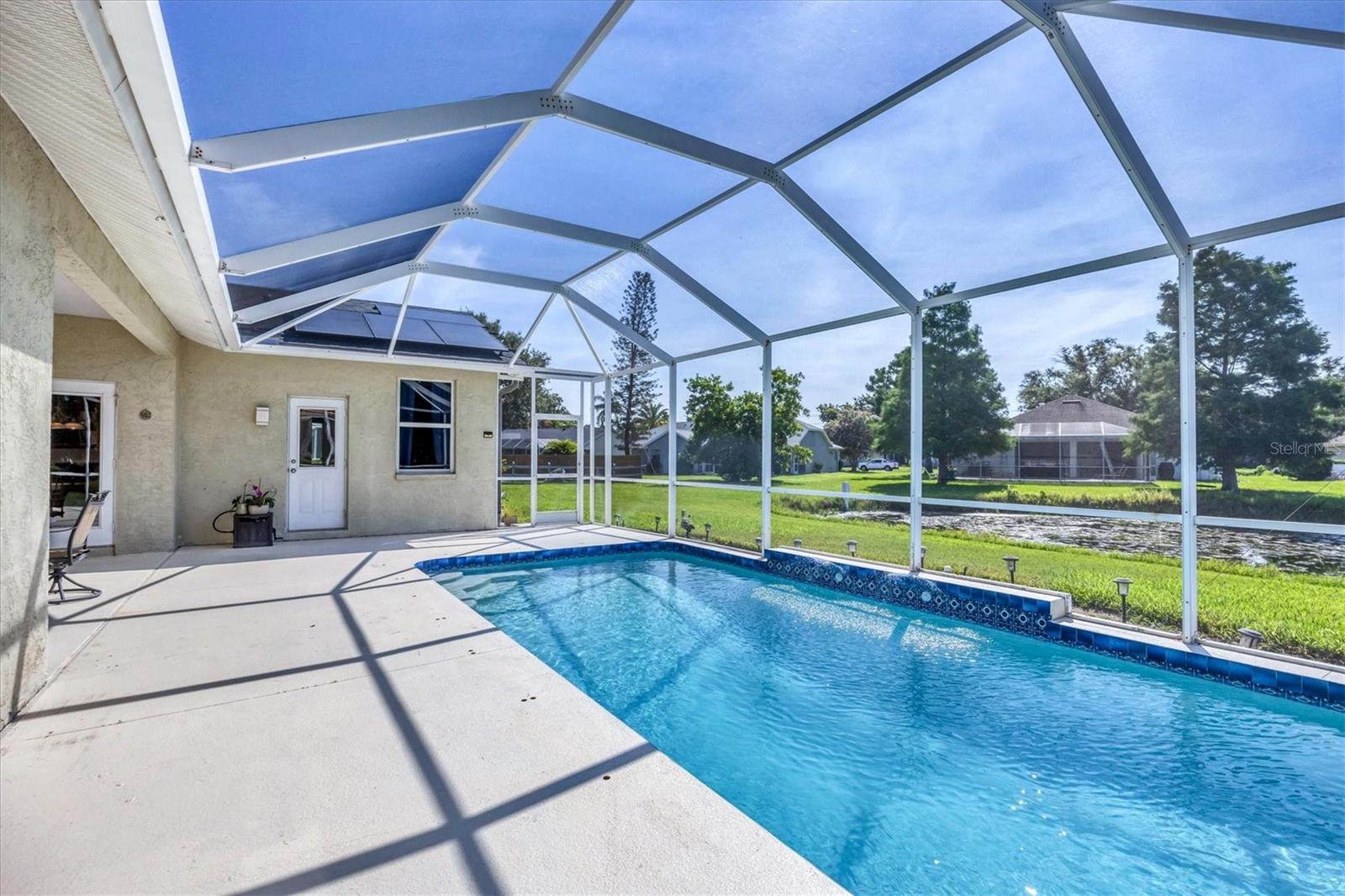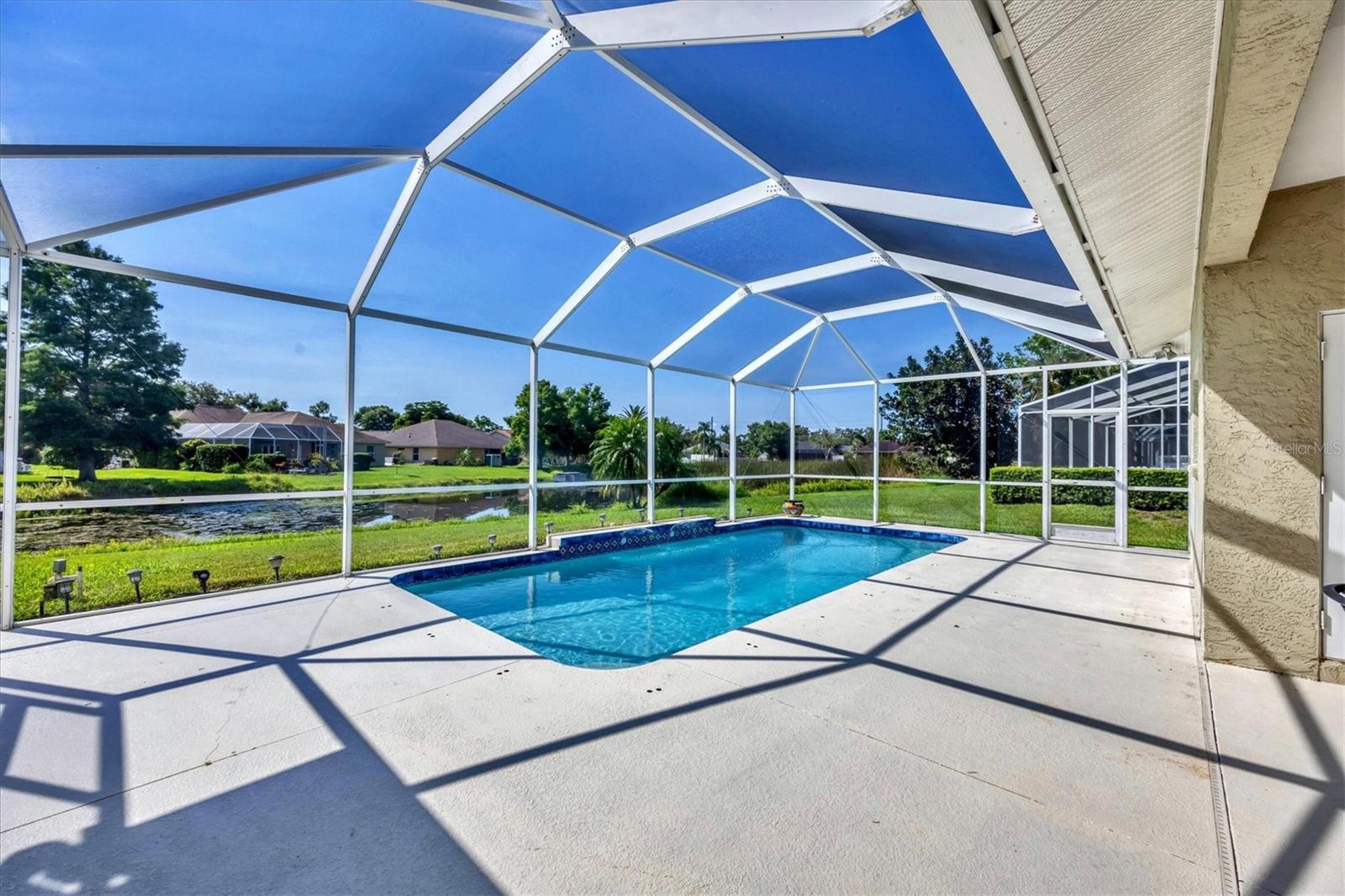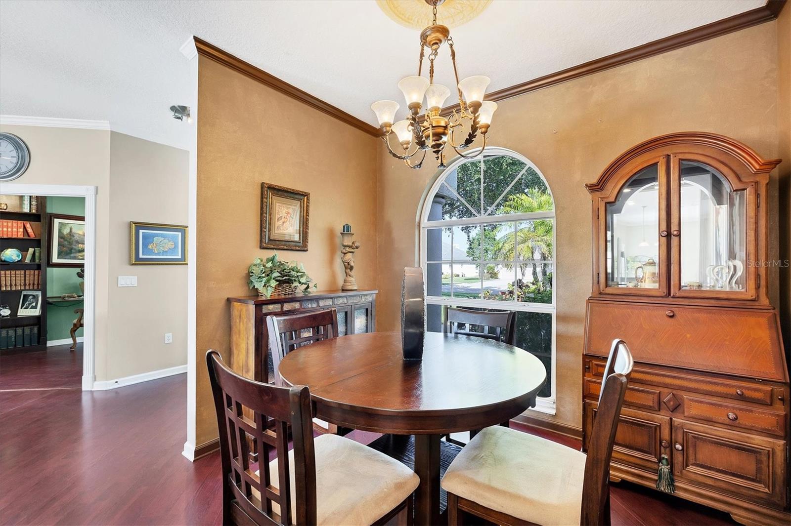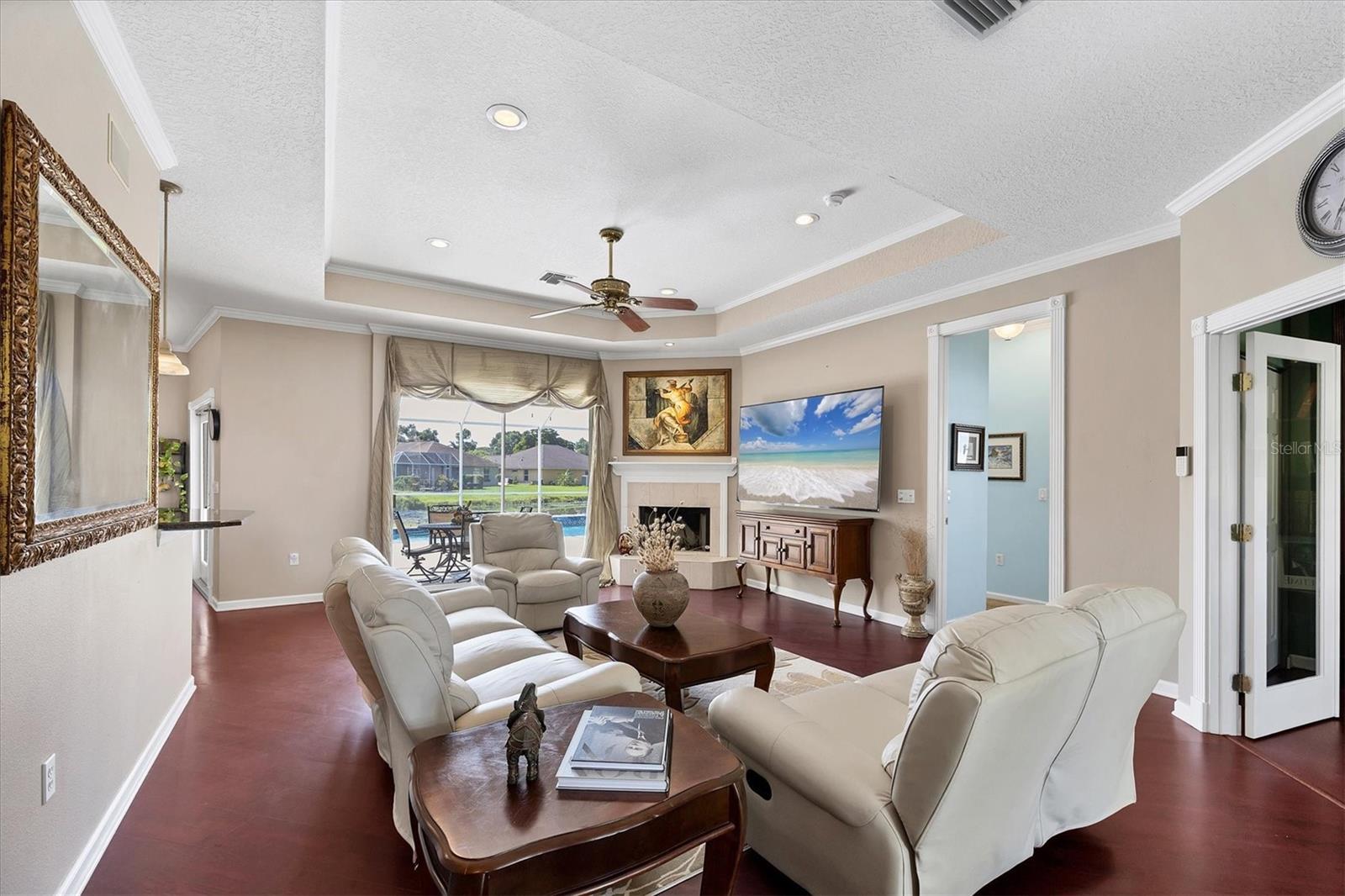 Welcome to 5786 Sandy Pointe Drive, a beautifully maintained lakefront pool home in Grove Pointe--one of Sarasota's established and central neighborhoods. From the moment you go inside, your eye is drawn to the tranquil water views of the pool and where the shimmering lake becomes a daily backdrop for relaxation and outdoor living. With four bedrooms, three full baths and a den, this single-level residence offers a flexible layout that suits everyday living and easy entertaining. Go inside and you're welcomed by a comfortable living area with tray ceilings, crown molding, recessed lighting and a wood-burning fireplace. Sliding glass doors open to the lanai, filling the space with natural light and providing a beautiful view. The adjoining dining room features an arched front window, classic chandelier and decorative trim, ideal for family dinners or gatherings. The kitchen is functional and charming, with white raised-panel cabinetry, granite countertops and backsplash, stainless steel appliances, and a breakfast bar with pendant lighting. Just off the kitchen, a built-in breakfast nook adds character. A set of French doors opens to a den that's ideal for a home office, complete with built-in bookshelves, crown molding and a large arched window. The split-bedroom floor plan offers privacy, with the primary suite tucked away and featuring French doors to the pool, transom windows, a walk-in closet and a spacious en-suite bath with soaking tub, glass block shower, dual vanities, and a private water closet. Two spacious, well-appointed guest bedrooms sit on opposite side of the home with a shared nearby guest bath includes a tub/shower combo and vanity. The third guest suite doubles as a large bonus room with built-in cabinetry, en-suite bath with pool access and generous closet space, ideal for guests, a media room or playroom. Outside, the screened lanai invites you to relax and unwind, with lighting, and access from the primary suite, living room and bonus room. The rectangular pool has been recently resurfaced and upgraded with new tile and a heater (2024), while the backyard offers privacy and a peaceful view of the lake. Additional highlights include a functional laundry room with storage and a two-car garage. The home is equipped with laminate flooring in main areas, spray foam attic insulation, energy-efficient solar panels (2022), a new HVAC system (2025), whole-house water filtration system and an asphalt, shingle roof (2018). In a quiet, tree-lined neighborhood, Grove Pointe is known for its convenient location. You're minutes from Interstate 75, top-rated schools and local parks. Siesta Key's world-famous beaches, downtown Sarasota, the Legacy Trail and University Town Center are all just a short drive away. This is a great opportunity to enjoy a spacious, move-in-ready home in one of Sarasota's desirable areas offering comfort, value and potential all in one.