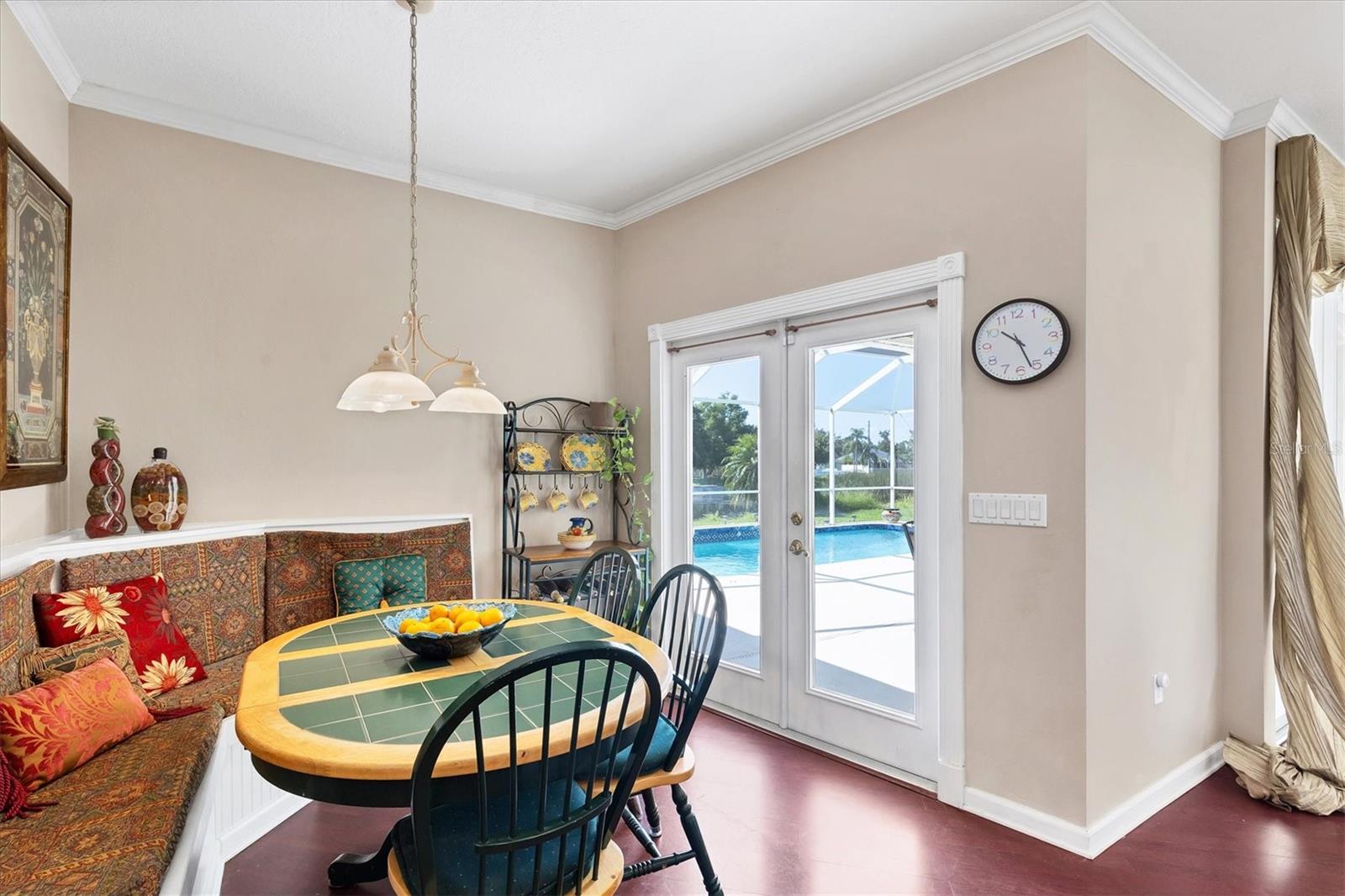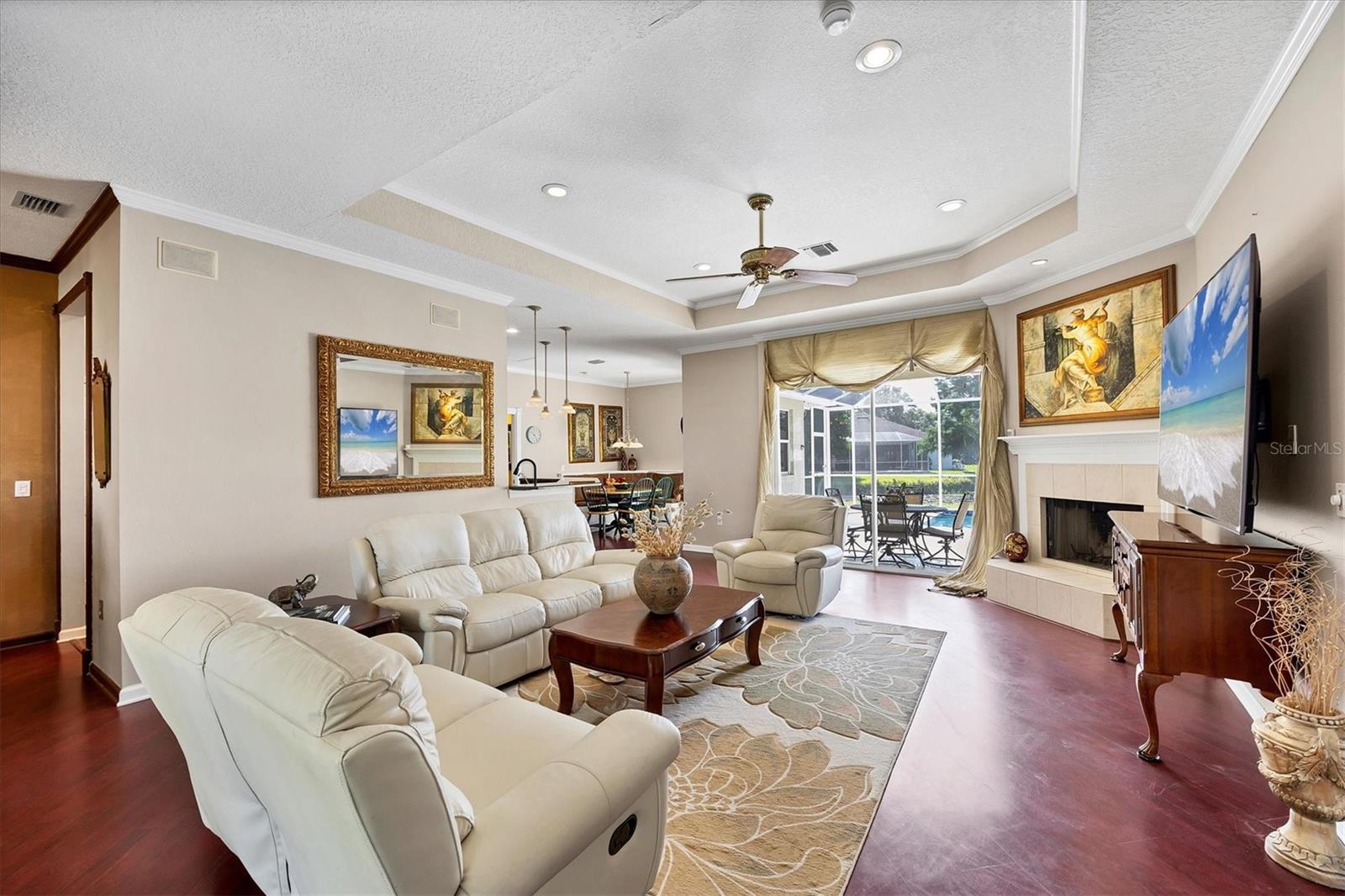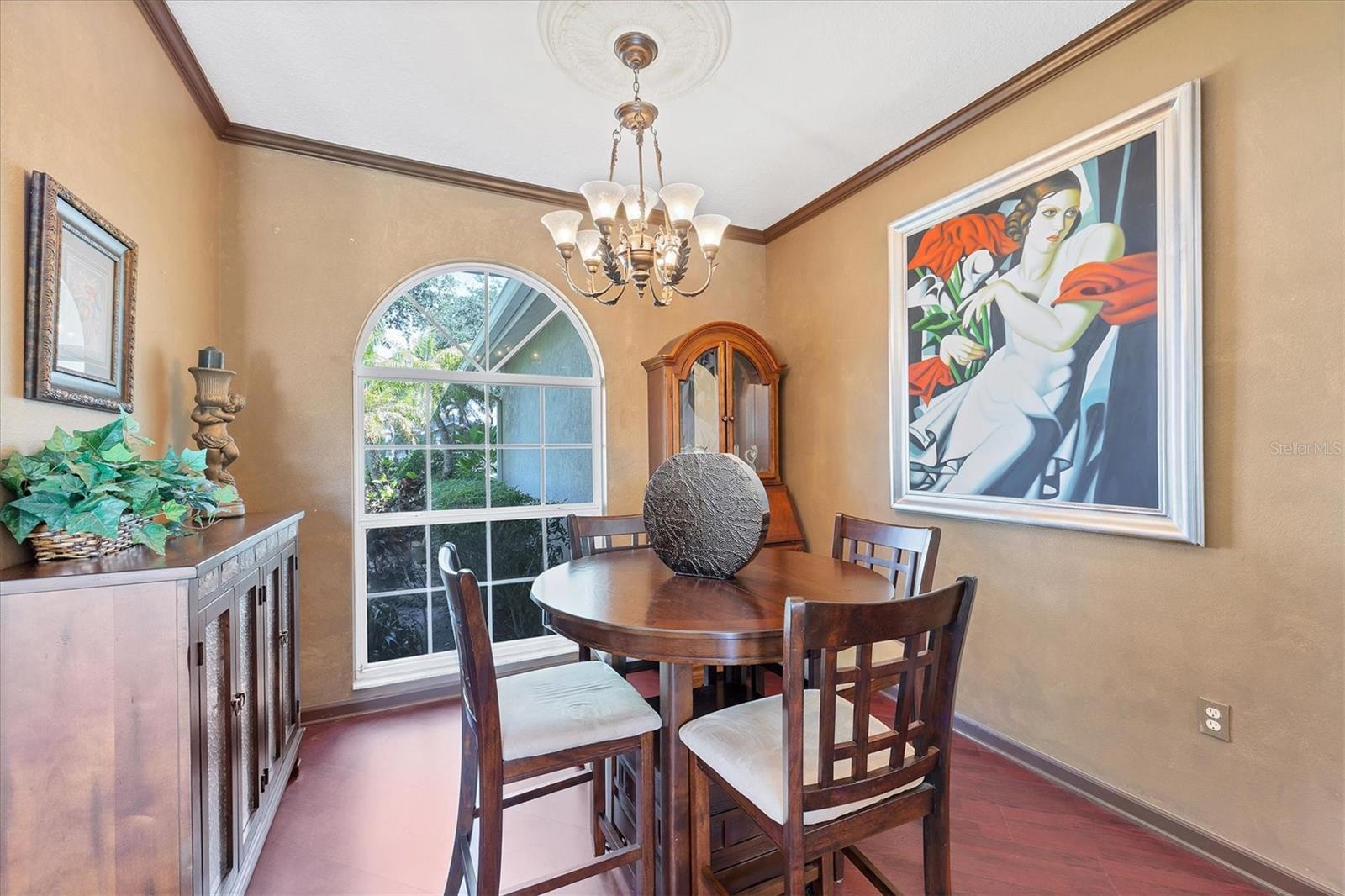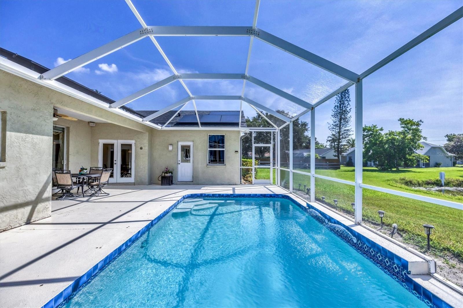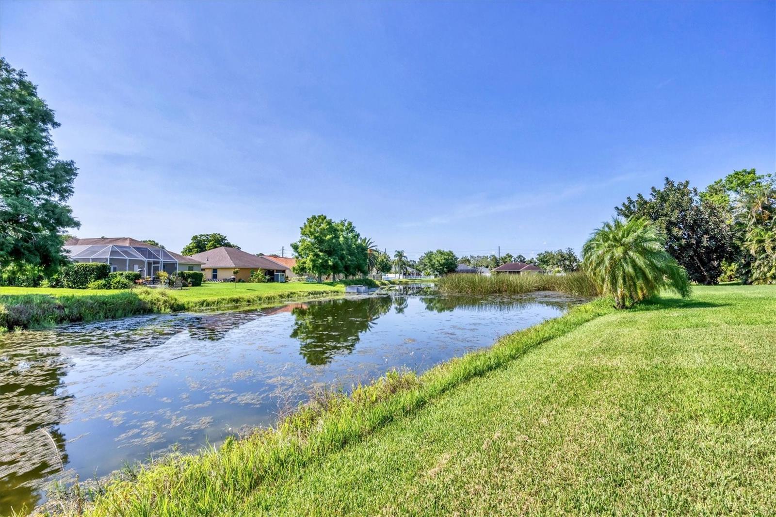 Welcome to 5786 Sandy Pointe Drive, a beautifully maintained lakefront pool home in Grove Pointe--one of Sarasota's established and central neighborhoods. From the moment you go inside, your eye is drawn to the tranquil water views of the pool and where the shimmering lake becomes a daily backdrop for relaxation and outdoor living. With four bedrooms, three full baths and a den, this single-level residence offers a flexible layout that suits everyday living and easy entertaining. Go inside and you're welcomed by a comfortable living area with tray ceilings, crown molding, recessed lighting and a wood-burning fireplace. Sliding glass doors open to the lanai, filling the space with natural light and providing a beautiful view. The adjoining dining room features an arched front window, classic chandelier and decorative trim, ideal for family dinners or gatherings. The kitchen is functional and charming, with white raised-panel cabinetry, granite countertops and backsplash, stainless steel appliances, and a breakfast bar with pendant lighting. Just off the kitchen, a built-in breakfast nook adds character. A set of French doors opens to a den that's ideal for a home office, complete with built-in bookshelves, crown molding and a large arched window. The split-bedroom floor plan offers privacy, with the primary suite tucked away and featuring French doors to the pool, transom windows, a walk-in closet and a spacious en-suite bath with soaking tub, glass block shower, dual vanities, and a private water closet. Two spacious, well-appointed guest bedrooms sit on opposite side of the home with a shared nearby guest bath includes a tub/shower combo and vanity. The third guest suite doubles as a large bonus room with built-in cabinetry, en-suite bath with pool access and generous closet space, ideal for guests, a media room or playroom. Outside, the screened lanai invites you to relax and unwind, with lighting, and access from the primary suite, living room and bonus room. The rectangular pool has been recently resurfaced and upgraded with new tile and a heater (2024), while the backyard offers privacy and a peaceful view of the lake. Additional highlights include a functional laundry room with storage and a two-car garage. The home is equipped with laminate flooring in main areas, spray foam attic insulation, energy-efficient solar panels (2022), a new HVAC system (2025), whole-house water filtration system and an asphalt, shingle roof (2018). In a quiet, tree-lined neighborhood, Grove Pointe is known for its convenient location. You're minutes from Interstate 75, top-rated schools and local parks. Siesta Key's world-famous beaches, downtown Sarasota, the Legacy Trail and University Town Center are all just a short drive away. This is a great opportunity to enjoy a spacious, move-in-ready home in one of Sarasota's desirable areas offering comfort, value and potential all in one.