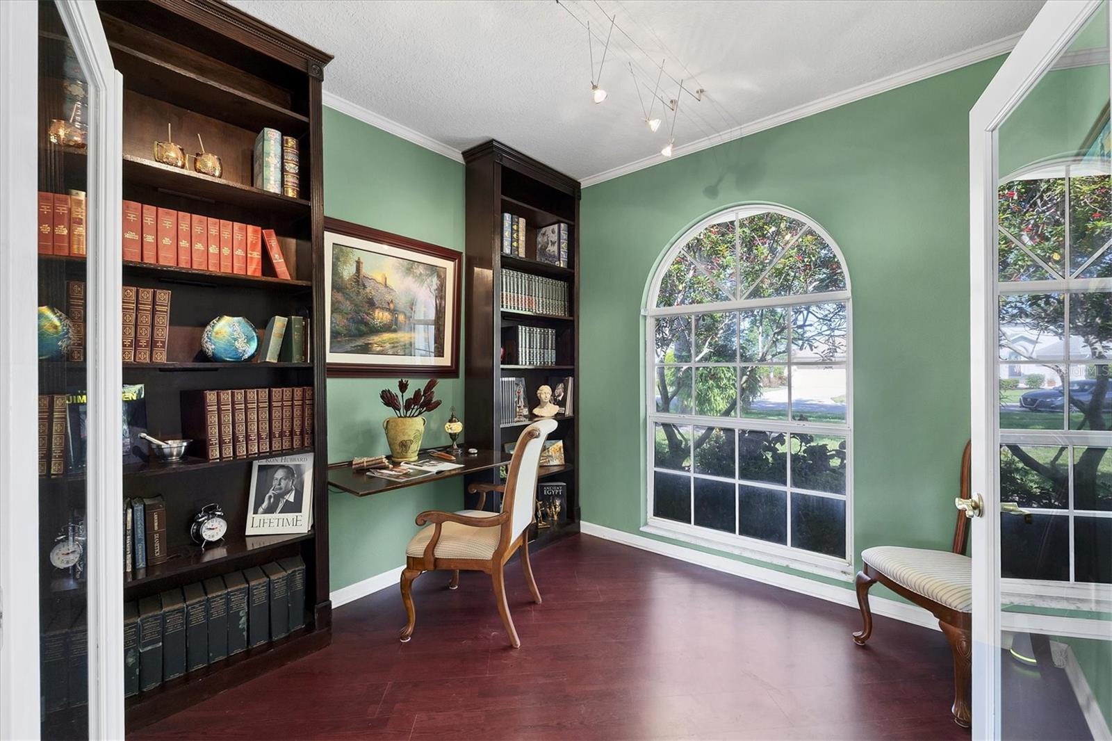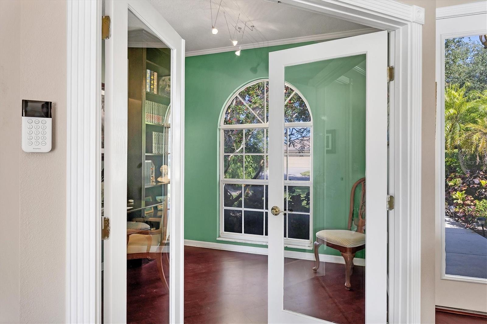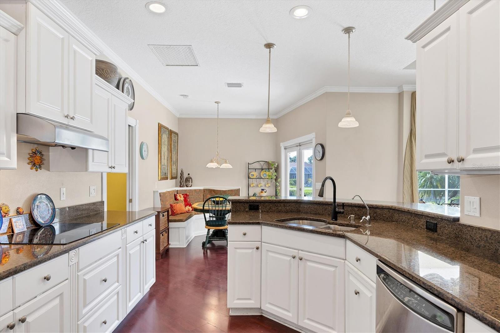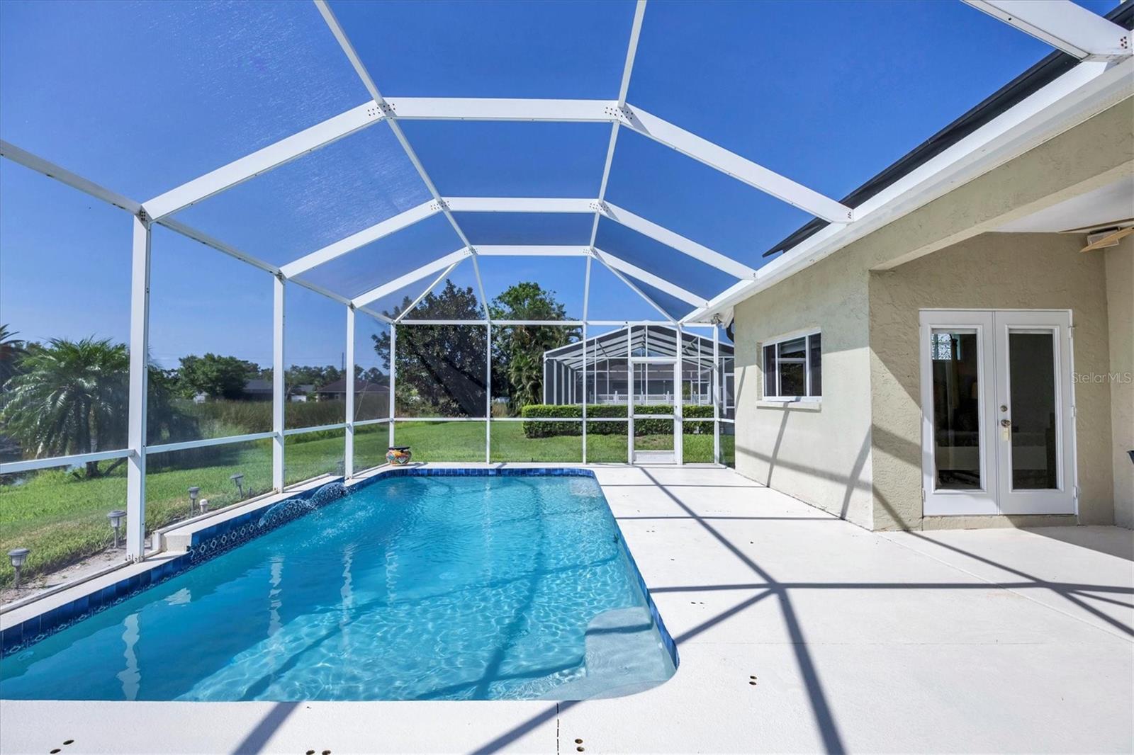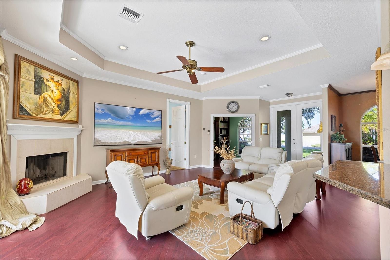 Welcome to 5786 Sandy Pointe Drive, a beautifully maintained lakefront pool home in Grove Pointe--one of Sarasota's established and central neighborhoods. From the moment you go inside, your eye is drawn to the tranquil water views of the pool and where the shimmering lake becomes a daily backdrop for relaxation and outdoor living. With four bedrooms, three full baths and a den, this single-level residence offers a flexible layout that suits everyday living and easy entertaining. Go inside and you're welcomed by a comfortable living area with tray ceilings, crown molding, recessed lighting and a wood-burning fireplace. Sliding glass doors open to the lanai, filling the space with natural light and providing a beautiful view. The adjoining dining room features an arched front window, classic chandelier and decorative trim, ideal for family dinners or gatherings. The kitchen is functional and charming, with white raised-panel cabinetry, granite countertops and backsplash, stainless steel appliances, and a breakfast bar with pendant lighting. Just off the kitchen, a built-in breakfast nook adds character. A set of French doors opens to a den that's ideal for a home office, complete with built-in bookshelves, crown molding and a large arched window. The split-bedroom floor plan offers privacy, with the primary suite tucked away and featuring French doors to the pool, transom windows, a walk-in closet and a spacious en-suite bath with soaking tub, glass block shower, dual vanities, and a private water closet. Two spacious, well-appointed guest bedrooms sit on opposite side of the home with a shared nearby guest bath includes a tub/shower combo and vanity. The third guest suite doubles as a large bonus room with built-in cabinetry, en-suite bath with pool access and generous closet space, ideal for guests, a media room or playroom. Outside, the screened lanai invites you to relax and unwind, with lighting, and access from the primary suite, living room and bonus room. The rectangular pool has been recently resurfaced and upgraded with new tile and a heater (2024), while the backyard offers privacy and a peaceful view of the lake. Additional highlights include a functional laundry room with storage and a two-car garage. The home is equipped with laminate flooring in main areas, spray foam attic insulation, energy-efficient solar panels (2022), a new HVAC system (2025), whole-house water filtration system and an asphalt, shingle roof (2018). In a quiet, tree-lined neighborhood, Grove Pointe is known for its convenient location. You're minutes from Interstate 75, top-rated schools and local parks. Siesta Key's world-famous beaches, downtown Sarasota, the Legacy Trail and University Town Center are all just a short drive away. This is a great opportunity to enjoy a spacious, move-in-ready home in one of Sarasota's desirable areas offering comfort, value and potential all in one.